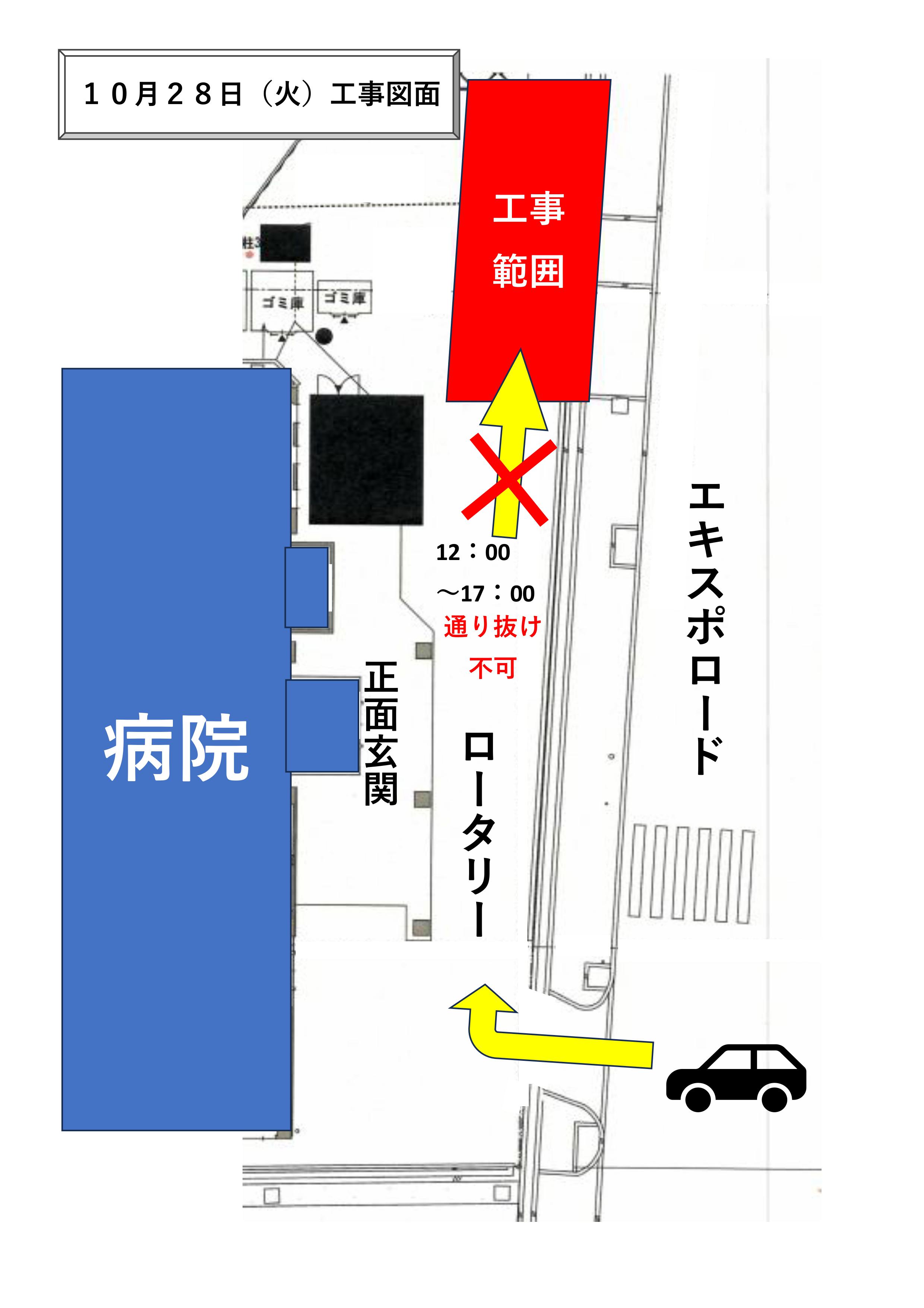 工事に伴い、下記の時間帯は正面玄関前ロータリーの通り抜けができなくなります。